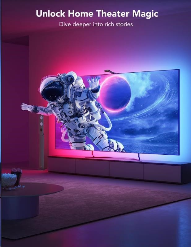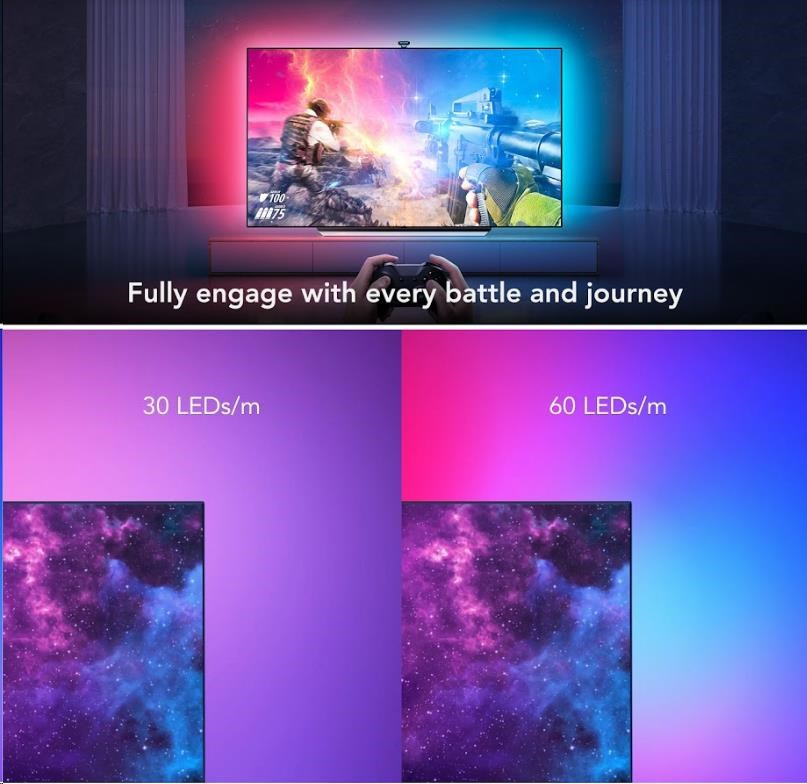 Vylepšite svoje herné, filmové a hudobné zážitky s živým chytrým osvetlením Govee DreamView T2. 16 miliónov farieb s viac ako 99 režimami efektov, z toho 4 režimy pre synchronizáciu s hudbou, povznese zážitok zo sledovania televízie alebo hrania hier na novú úroveň vďaka SMART technológii ColorMatch, ktorá sníma obrazovku revolučnou duálnou kamerou a automaticky podľa toho upravuje nastavenie svetiel. Ovládajú sa hlasom cez Siri, Amazon Alexa alebo Google Assistant, cez aplikáciu alebo Control box. Nebudete preto ani musieť vstávať z gauča. Farebné podsvietenie opticky zväčšuje obraz a tiež šetrí vaše oči.