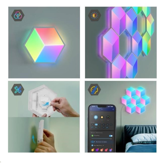 Vylepšite interiér a herné, filmové a hudobné zážitky s dizajnovým svetlom Hexa PRO 3D Smart LED. Vďaka technológii RGBIC zobrazuje až 57 farieb naraz. Farby si môžete nastaviť po jednotlivých sekciách a kreatívne si pohrať s 3D efektom osvetlenia. Celkovo dokáže zobraziť až 16 miliónov farieb s intenzitou 1-100%. Určite si vyberiete z mnohých režimov osvetlenia a pri počúvaní obľúbenej hudby si môžete zvoliť aj zo 6 rytmických režimov. Svetlá sa ovládajú hlasovo cez Siri, Amazon Alexa alebo Google Assistant alebo prostredníctvom aplikácie Govee Home na chytrom telefóne alebo tablete. Svetlo je určené na inštaláciu na stenu a jeho tvar si môžete prispôsobiť podľa vlastnej fantázie. Jednoduchá inštalácia bez vŕtania s životnosťou až 50.000 hodín.