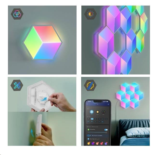 Vylepšite interiér a herné, filmové a hudobné zážitky s dizajnovým svetlom Hexa PRO 3D Smart LED. Vďaka technológii RGBIC zobrazuje až 57 farieb naraz. Farby si môžete nastaviť po jednotlivých sekciách a kreatívne si pohrať s 3D efektom osvetlenia. Celkovo dokáže zobraziť až 16 miliónov farieb s intenzitou 1-100%. Určite si vyberiete z mnohých režimov osvetlenia a pri počúvaní obľúbenej hudby si môžete zvoliť aj zo 6 rytmických režimov. Svetlá sa ovládajú hlasovo cez Siri, Amazon Alexa alebo Google Assistant alebo prostredníctvom aplikácie Govee Home na chytrom telefóne alebo tablete. Svetlo je určené na inštaláciu na stenu a jeho tvar si môžete prispôsobiť podľa vlastnej fantázie. Jednoduchá inštalácia bez vŕtania s životnosťou až 50.000 hodín.