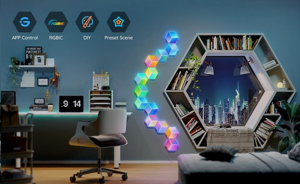 Govee Hexa Pro ponúka 38 rôznych režimov pre dokonalé naladenie svetelnej atmosféry. Govee technológia RGBIC dokáže zobraziť až 57 farieb naraz z celkového rozsahu 16 miliónov farieb pri intenzite 1-100%. Môže sa tiež pochváliť životnosťou až 50.000 hodín.