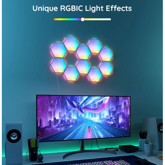 Vylepšite interiér a herné, filmové a hudobné zážitky s dizajnovým svetlom Hexa Smart LED. Vďaka technológii RGBIC zobrazuje až 57 farieb naraz. Farebnosť si môžete nastaviť po jednotlivých sekciách a kreatívne sa pohrať. Celkovo dokáže zobraziť až 16 miliónov farieb s intenzitou 1-100%. Určite si vyberiete z mnohých režimov osvetlenia a pri počúvaní obľúbenej hudby si môžete zvoliť aj zo 6 rytmických režimov. Svetlá sa ovládajú hlasom cez Siri, Amazon Alexa alebo Google Assistant alebo cez aplikáciu Govee Home na smartfóne alebo tablete. Svetlo je určené na inštaláciu na stenu a jeho tvar si môžete prispôsobiť podľa vlastnej fantázie. Jednoduchá inštalácia bez vŕtania so životnosťou až 50.000 hodín.