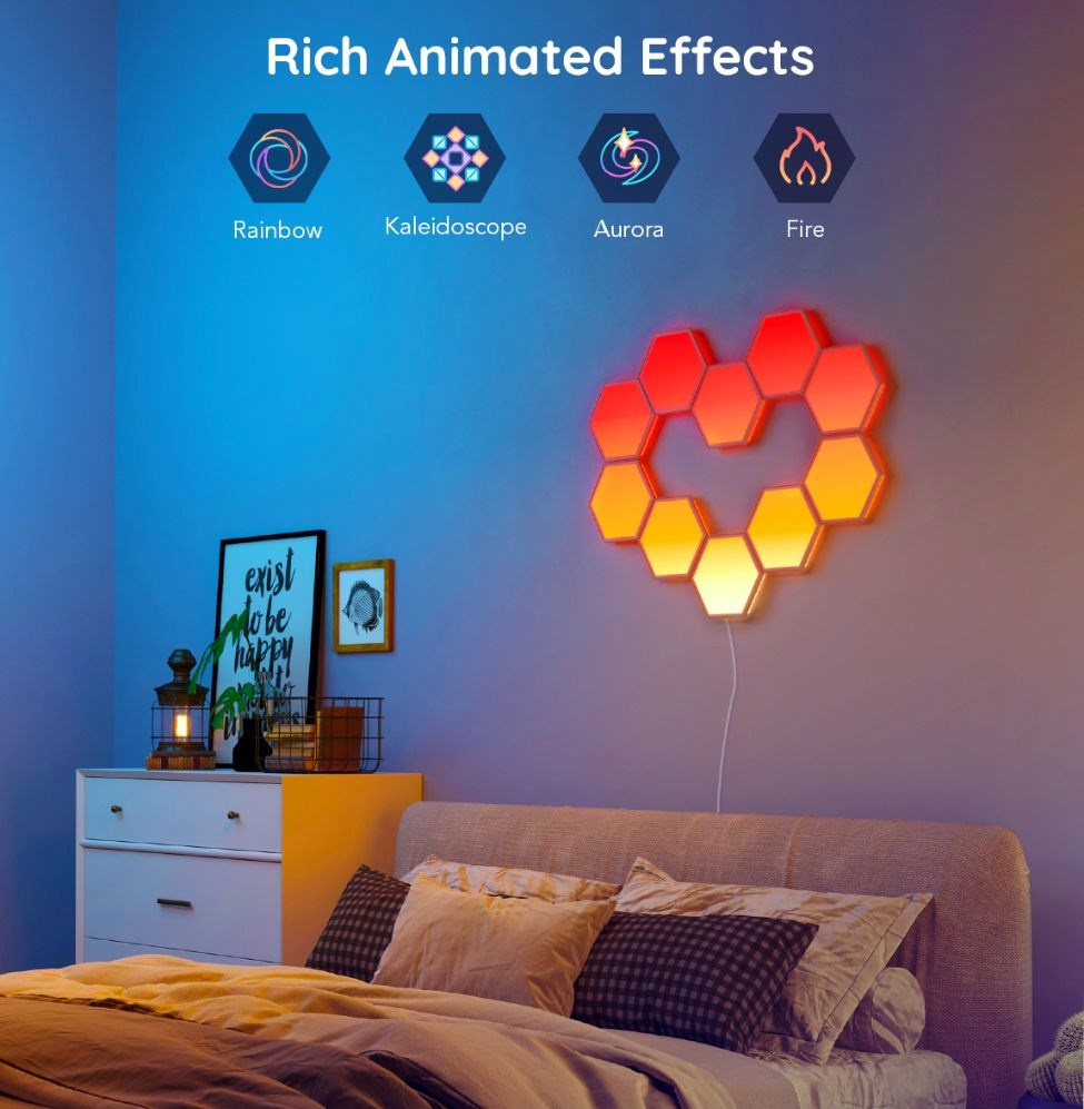 Govee Hexa ponúka 38 rôznych režimov na dokonalé naladenie svetelnej atmosféry. Govee technológia RGBIC dokáže zobraziť až 57 farieb naraz z celkovej škály 16 miliónov farieb pri intenzite 1-100%. Môže sa tiež pochváliť životnosťou až 50.000 hodín.