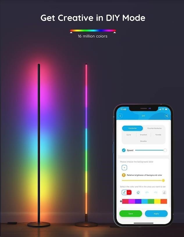Urobte si pohodlnejšie svoju domácnosť chytrou rohovou lampou Govee Smart Corner Floor Lamp, ktorá zaujme na prvý pohľad. Ponúka 16 miliónov farieb s 64 farebnými režimami a 6 režimov na synchronizáciu s hudbou. Svetlo sa ovláda hlasom cez Siri, Amazon Alexa alebo Google Assistant, cez aplikáciu na chytrých telefónoch a tabletoch s operačnými systémami iOS a Android alebo cez integrovaný ovládač. Lampa je vybavená úspornou LED žiarovkou s technológiou RGBICWW, ktorá umožňuje zobrazenie viacerých farieb naraz a má dlhú životnosť 50.000 hodín. Farebná teplota sa dá upraviť v rozsahu od 3300K do 4300K pri maximálnej icvitivosti až 1000 lumenov.