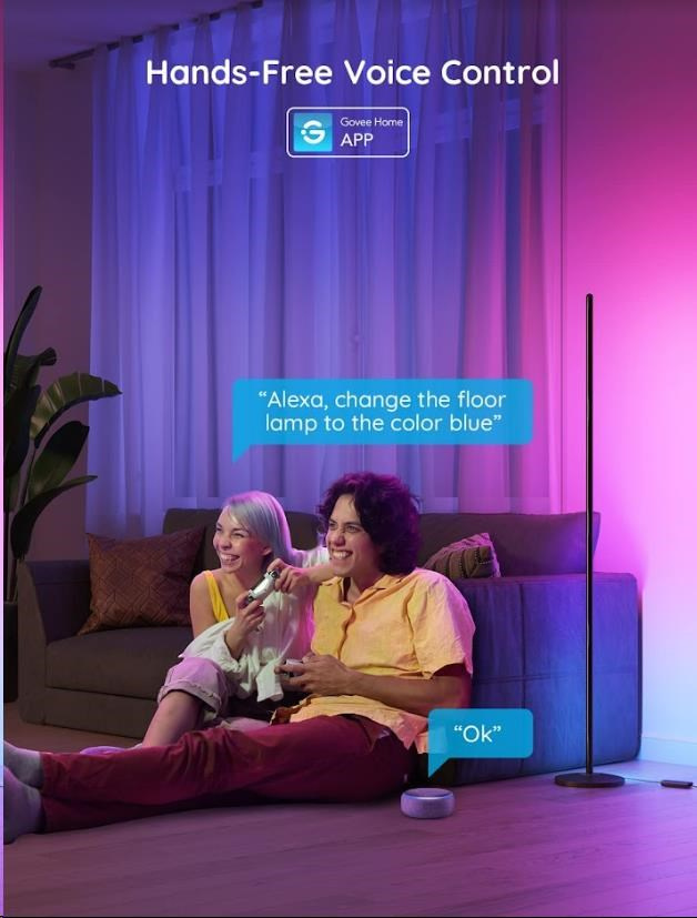 Lampa Govee Smart Corner Floor Lamp je kompatibilná s asistentmi Alexa, Google Assistant a Siri. Teraz môžete Govee Smart Corner Floor Lamp zapnúť/vypnúť, upraviť úrovne jasu alebo zmeniť ich farbu pomocou hlasových príkazov z pohodlia pohovky alebo postele. Ovládanie lampy je možné tiež priamo na paneli alebo cez aplikáciu vo vašom smartfóne alebo tablete.