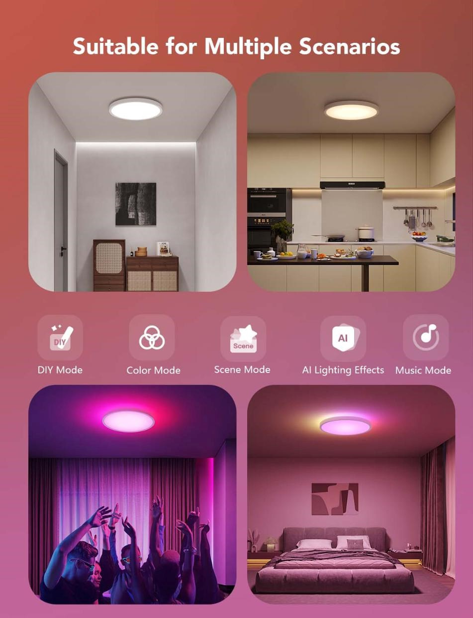 Ak hľadáte inteligentné stropné svietidlo, ktoré dokáže viac než len svietiť, Govee je skvelou voľbou. Toto elegantné duálne svetlo kombinuje technológiu RGBIC s bielymi LED diódami a ponúka živé farebné podsvietenie, ako aj nastaviteľnú bielu farbu v rozsahu od teplej 2700 K do studenej 6500 K. Vďaka viac ako 70 prednastaveným scénam a funkcii synchronizácie s hudbou sa ľahko prispôsobí vašej nálade a príležitosti – či už organizujete večierok, alebo chcete relaxovať. Ovládanie je jednoduché prostredníctvom aplikácie Govee Home alebo hlasom cez Alexu a Google Assistant a svetlo funguje aj s protokolom Matter, takže ho môžete zapojiť do HomeKit alebo Samsung Smart Things. Funkcia DreamView navyše umožňuje synchronizáciu s ďalšími svetlami Govee pre zjednotenie osvetlenia v celom priestore. S jasom až 2400 lúmenov a plynulým stmievaním je toto svietidlo ideálnou voľbou pre modernú domácnosť.