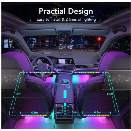 Energeticky úsporný interiér inteligentné LED pásiky Govee Smart RGBIC pre autá so životnosťou až 50 000 hodín vylepšia interiér vášho auta a poskytnú zážitok, ktorý sa vyskytuje v luxusných autách. Môžete ich použiť prakticky kdekoľvek, kde je zapaľovanie. Zobrazuje až 16 miliónov farieb, ktorých intenzitu je možné nastaviť od 1 do 100 %. Vďaka technológii RGBIC môžete pásik rozdeliť na samostatné segmenty, pre ktoré si potom môžete vybrať rôzne farby. Vyberte si z 30 režimov svietenia a svetlá sa synchronizujú pri počúvaní obľúbenej hudby. Alebo si jednoducho nastavte vlastné farebné kombinácie v režime DIY. Príkazy môžete zadávať prostredníctvom aplikácie Govee Home na svojom smartfóne alebo tablete alebo priamo na Control Boxe. Inštalácia je jednoduchá a je rozdelená na prednú a zadnú časť vozidla.
