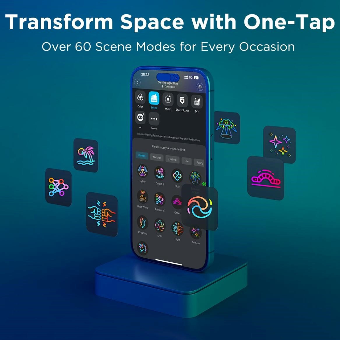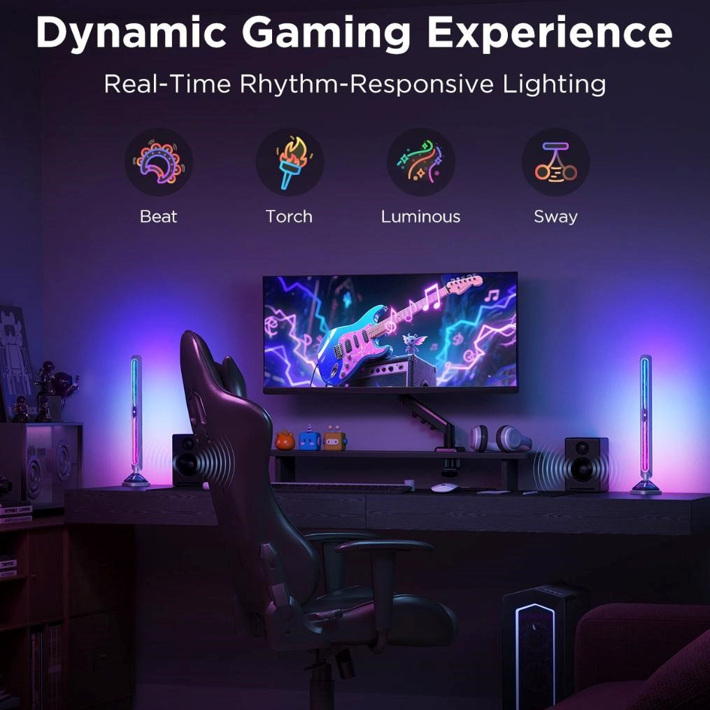 Panely ponúkajú viac ako 60 jedinečných svetelných scén, ktoré vám umožnia prispôsobiť osvetlenie vašej nálade a štýlu. Špeciálne vizuálne efekty dokážu vytvoriť dynamickú a pohlcujúcu atmosféru nielen pri hraní hier, ale aj pri sledovaní filmov alebo počúvaní hudby. Vďaka funkcii synchronizácie s hudbou reagujú svetlá v reálnom čase na rytmus a zvuk, čo prináša živý a interaktívny zážitok, ktorý oživí každú miestnosť.