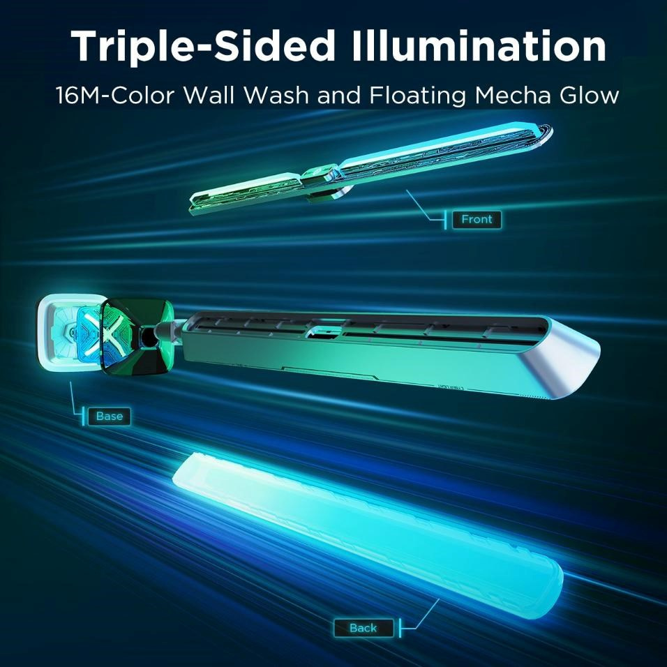 Panely ponúkajú jedinečné trojité osvetlenie so 16 miliónmi farieb a tromi samostatnými zdrojmi svetla. Základňa poskytuje pevnú oporu a výrazné svetelné body, zadná časť vytvára mäkké, rozptýlené svetlo, ktoré dodáva priestoru príjemný odtieň, a predná časť s kybernetickými vzormi, ktoré dodávajú celkovému efektu hĺbku a štýl. Táto kombinácia umožňuje vytvoriť bohatú a atmosférickú atmosféru, ktorá dokonale doplní vaše herné alebo multimediálne zážitky.
