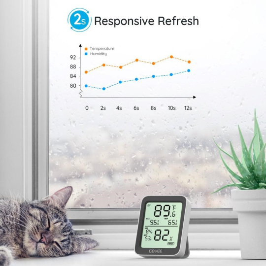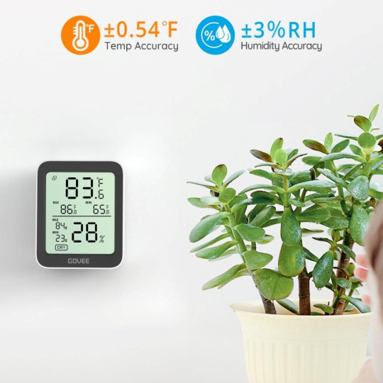 Udržujte svoje vnútorné prostredie príjemné a zdravé. Inteligentný monitor teploty a vlhkosti od Govee. Tento kompaktný, ale výkonný klimatický monitor zobrazuje aktuálnu teplotu a vlhkosť na prehľadnom LCD displeji a vďaka Bluetooth pripojeniu k vášmu telefónu máte svoje údaje vždy poruke. Vďaka vysoko presným senzorom (±0,3 °C pre teplotu a ±3 % RH pre vlhkosť) môžete ľahko sledovať zmeny v akejkoľvek miestnosti, kancelárii alebo skleníku.