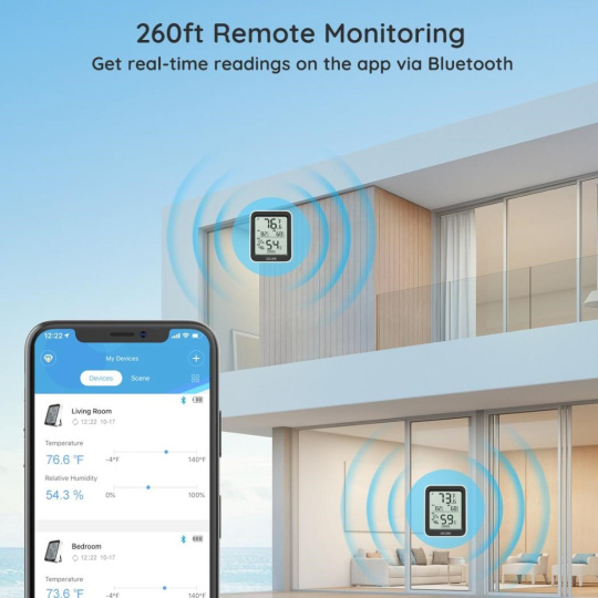 Veľký LCD displej zobrazuje aktuálnu teplotu a vlhkosť jasne a prehľadne. Všetko, čo potrebujete vedieť, vidíte na prvý pohľad, bez toho, aby ste museli kontrolovať telefón. Displej je ideálny na rýchle vizuálne kontroly vo vašej domácnosti, kancelárii alebo sklade. Vďaka prehľadnému a jednoduchému displeju máte neustály prehľad o klíme.