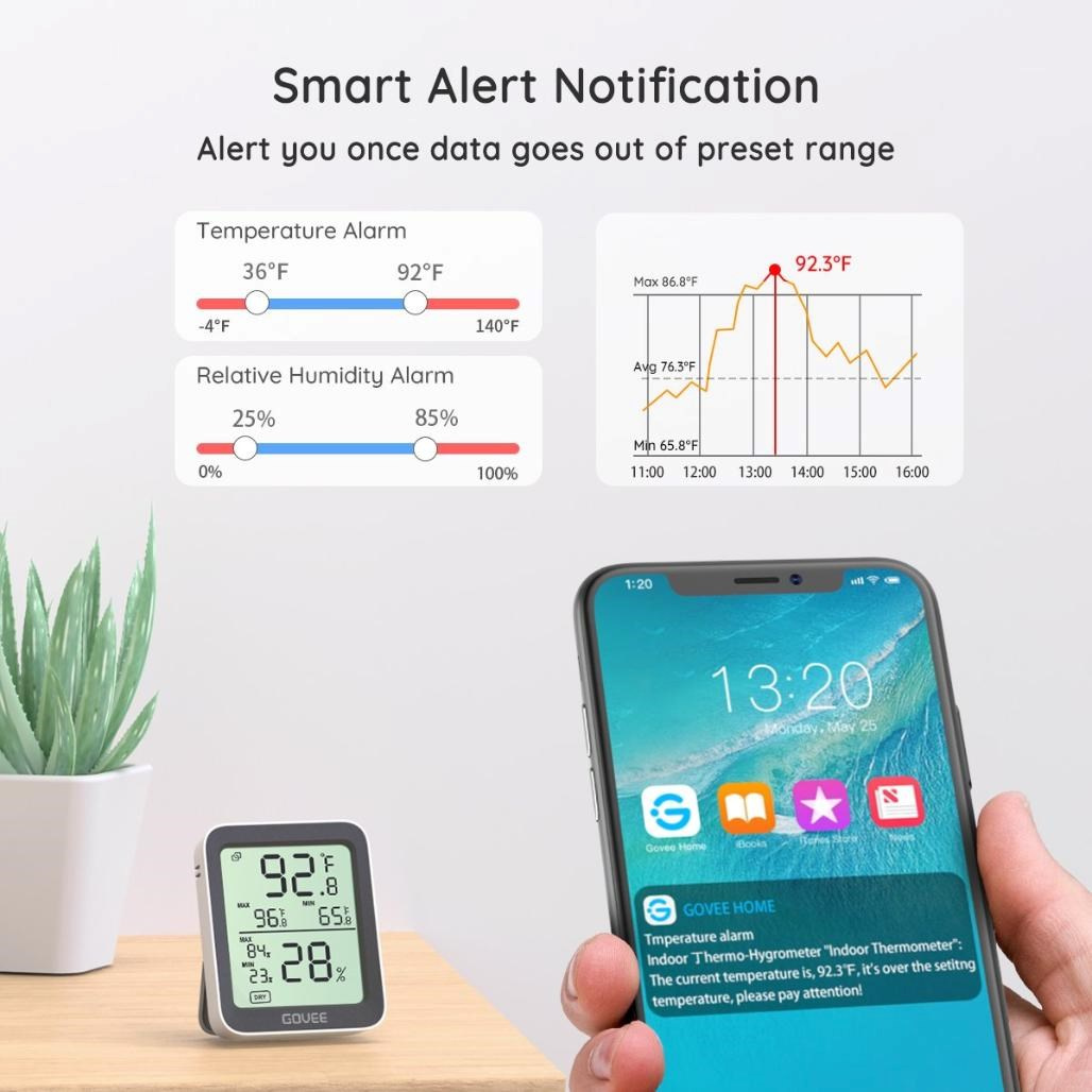 Vďaka prispôsobiteľným upozorneniam v aplikácii Govee Home budete okamžite informovaní, ak teplota alebo vlhkosť prekročí nastavené limity. Táto funkcia pomáha predchádzať poškodeniu rastlín, nábytku alebo citlivých predmetov. Upozornenia sa zobrazujú priamo na vašom telefóne, takže môžete sledovať situáciu aj keď ste preč. Výsledkom je bezpečné, stabilné a kontrolované prostredie.