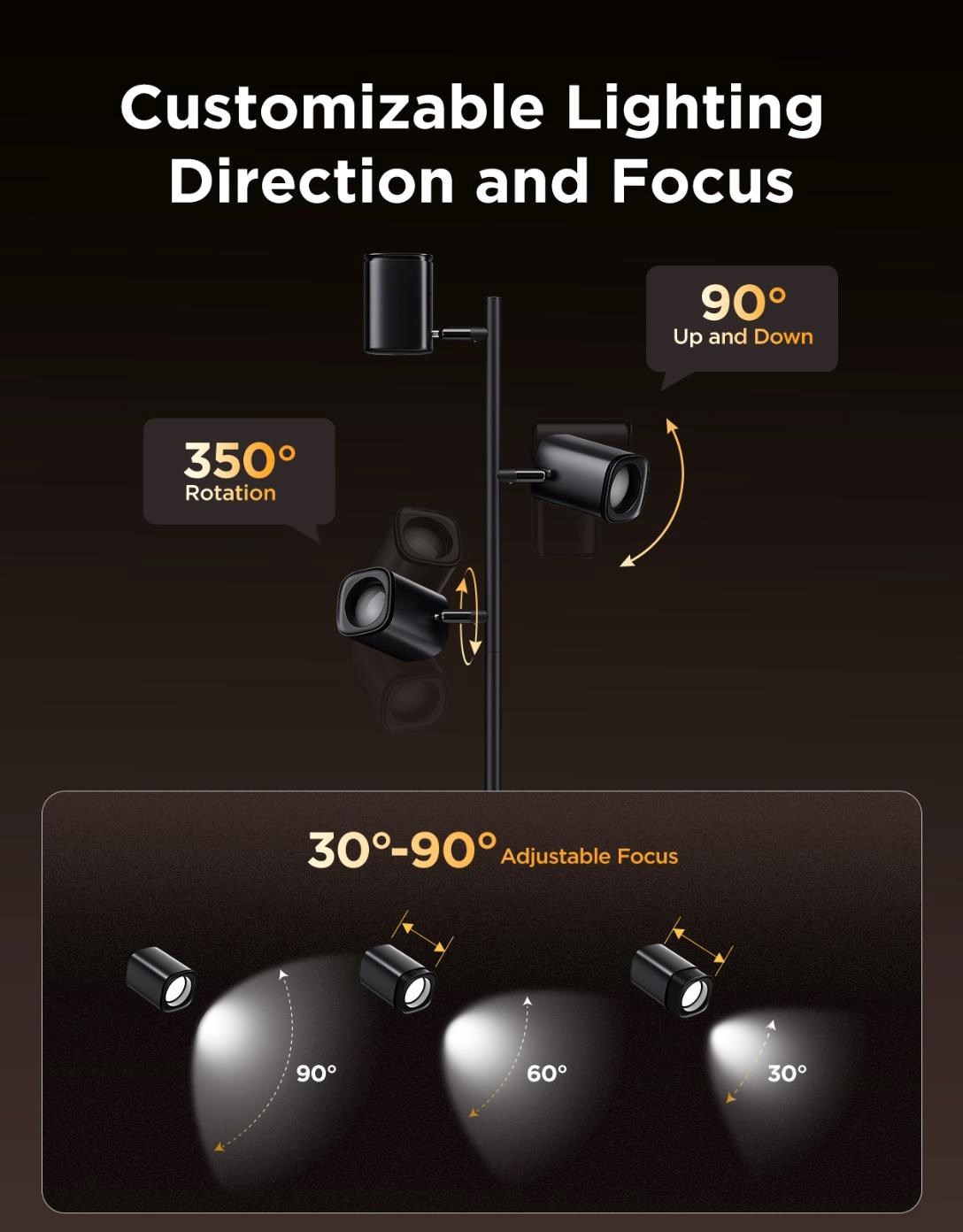 Plne nastaviteľné ramená a hlavica umožňujú dosiahnuť dokonalé osvetlenie. Lampy majú zameranie v rozmedzí 30°–90° na rozptýlené alebo koncentrované svetlo. Ramena sa otáčajú 350° horizontálne a 90° vertikálne. To vám dáva možnosť presného nasvietenia každej časti vašej miestnosti.