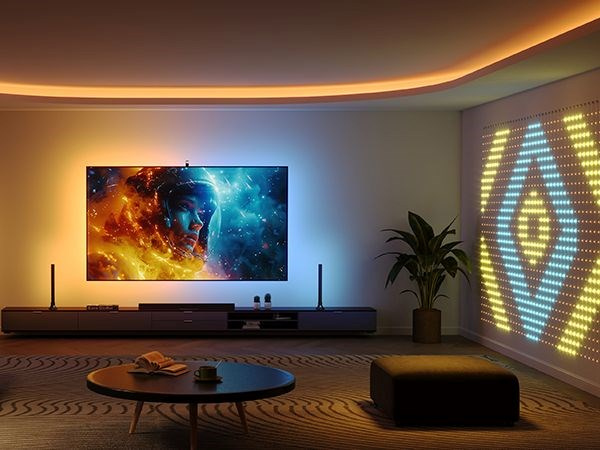 Súprava osvetlenia sa spolieha na fotoaparát, ktorý presne reprodukuje farby na obrazovke. To je teraz rozšírené o korekciu skreslenia, takže podsvietenie presne kopíruje farby na obrazovke a vytvára tak pohlcujúci vizuálny zážitok. Kamera je umiestnená nad televízorom, aby bola kompatibilná so soundbarmi a prispôsobila sa aj modelom s ultratenkou obrazovkou.
