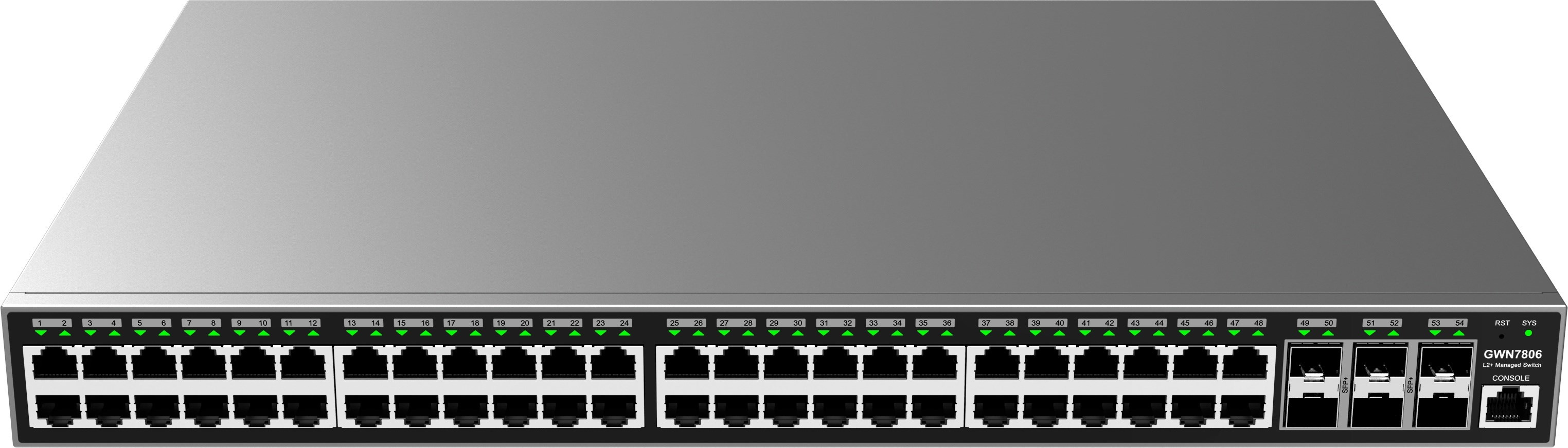 GWN7806(P) je vysoce výkonný spravovaný síťový přepínač vrstvy 2+ s 48 porty, který malým a středním podnikům umožňuje budovat škálovatelné, bezpečné a inteligentní podnikové sítě s plnou správou