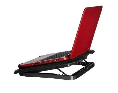 - chladiaci stojan pre notebook - pohodlné pracovné podmienky vďaka naklonenej polohe notebooku - ventilátor s modrým LED podsvietením - stabilné umiestnenie vďaka pogumovanej spodnej časti - nízka spotreba energie (šetrí batériu notebooku) - napájanie cez USB - veľmi nízka prevádzková hlučnosť Technické parametre: - pre notebooky s uhlopriečkou 34 až 40 cm (13,3" až 15,6") - hlasitosť: 23 dBA - počet ventilátorov: 2 - spotreba prúdu (USB): 320 mA - rozmery: 27 x 3 x 37 cm - hmotnosť: 802 g - farba: čierna..