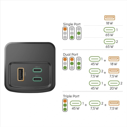 Powerbanka má celkový výstupní výkon max. 65 W. Připojíte-li dvě zařízení k oběma USB-C zásuvkám, výkon se rozdělí na 45 W a 20 W. Připojíte-li zařízení ke všem třem zásuvkám, výkon se rozdělí na 45 W pro jednu USB-C zásuvku, 7,5 W pro druhou USB-C a 7,5 W pro USB-A zásuvku.