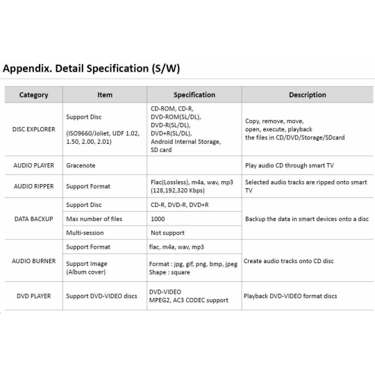| Supported disc formats | Audio CD, CD ROM, Video CD CD R, CD RW DVD ROM,DVD Video,DVD RAM DVD R,DVD RDL,DVD RW DVD+R,DVD+RDL,DVD+RW |
