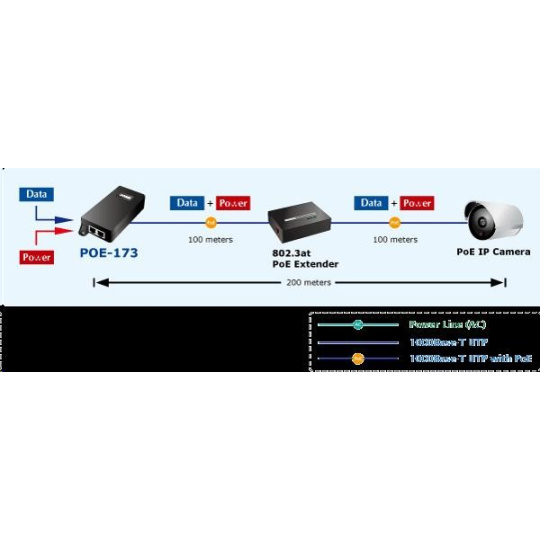 "Power over Ethernet Injector" s maximálnou zaťažiteľnosťou do 60 W na napájanie zariadení cez Ethernet. Určené na použitie s kamerami PTZ, dotykovými monitormi, zariadeniami VoIP alebo prístupovými bodmi WiFi. Napájanie PoE je možné implementovať aj na gigabitový Ethernet, napájanie sa prenáša po všetkých UTP/FTP ethernetových vodičoch, injektor podporuje IEEE 802.3 / 802.3u / 802.3ab, 10/100/1000Base-T. Injektor je kompatibilný so štandardom IEEE 802.3af / 802.3at. Ak napájané zariadenie nemá možnosť napájania PoE IEEE802.3at alebo chcete naplno využiť výkon injektora, musíte použiť rozdeľovač POE-171S. Ak máte zariadenie, ktoré možno napájať prostredníctvom PoE 802.3af/802.3at, ktoré môžu byť pripojené priamo k vstrekovaču. Informácie: Rozhranie: 2x port RJ-45: 1x dátový + napájací výstup a 1x dátový vstup IEEE 802.3af/at, 50V/DC na linku, zaťažiteľnosť do 60W Napájanie: interný zdroj 100-240V/AC Rozmery: 115 x 62.5 x 31 mm Hmotnosť: 177 g..