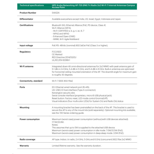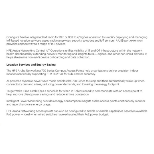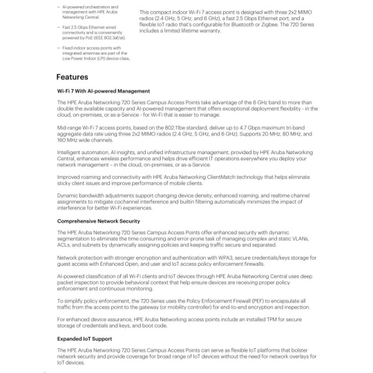 Designed to deliver cutting-edge Wi-Fi performance, the HPE Aruba Networking 720 Series Campus Access Points offer enterprises a cost-effective solution that meets the demand for fast, secure, high-performance connectivity. Leveraging the latest Wi-Fi 7 standard, these access points enhance security across both wired and wireless networks, support Internet of Things (IoT) devices, and provide accurate location-aware capabilities. HPE Aruba Networking Central helps drive efficient operations and provides AI-automation and machine learning (ML) insights for fine-tuned wireless connectivity across diverse environments. Like all the HPE Aruba Networking access points, this series is Wi-Fi CERTIFIED and includes a limited lifetime warranty for investment protection.