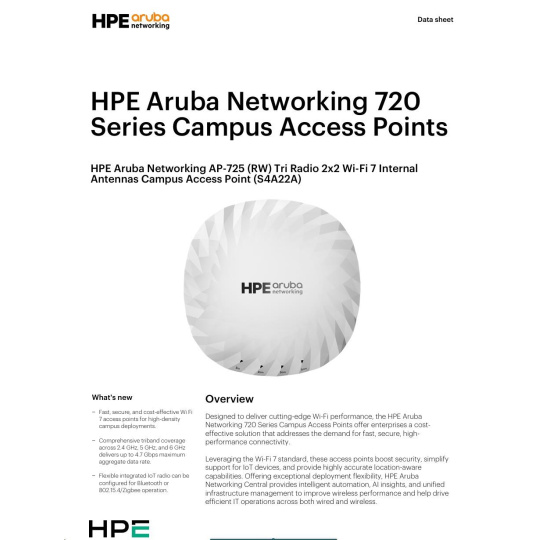 As part of a full portfolio of Wi-Fi 7 access points, the HPE Aruba Networking 720 Series Campus Access Points offer a cost-effective way to deliver fast, resilient, and secure Wi-Fi 7 wireless access across campus networks. Supported by HPE Aruba Networking Central, they help deliver an AI-powered, security-first network.