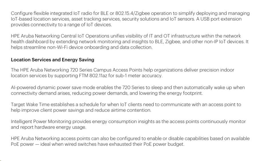 The HPE Aruba Networking 720 Series Campus Access Points includes an integrated Bluetooth 5.4 or 802.15.4 radio for Zigbee support to simplify deploying and managing IoT-based location services, asset tracking services, security solutions, and IoT sensors. There is also a USB host port to provide IoT connectivity to a wider range of devices.