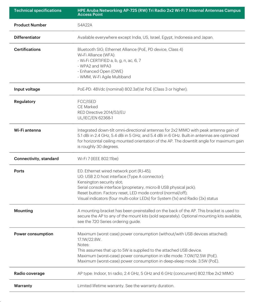 • Coverage: HPE Aruba Networking hardware limited lifetime warranty