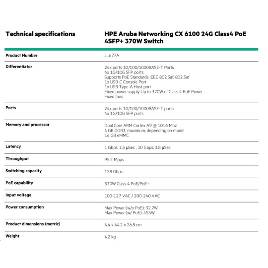 HPE Aruba Networking CX 6100 24G Class4 PoE 4SFP+ 370W Switch