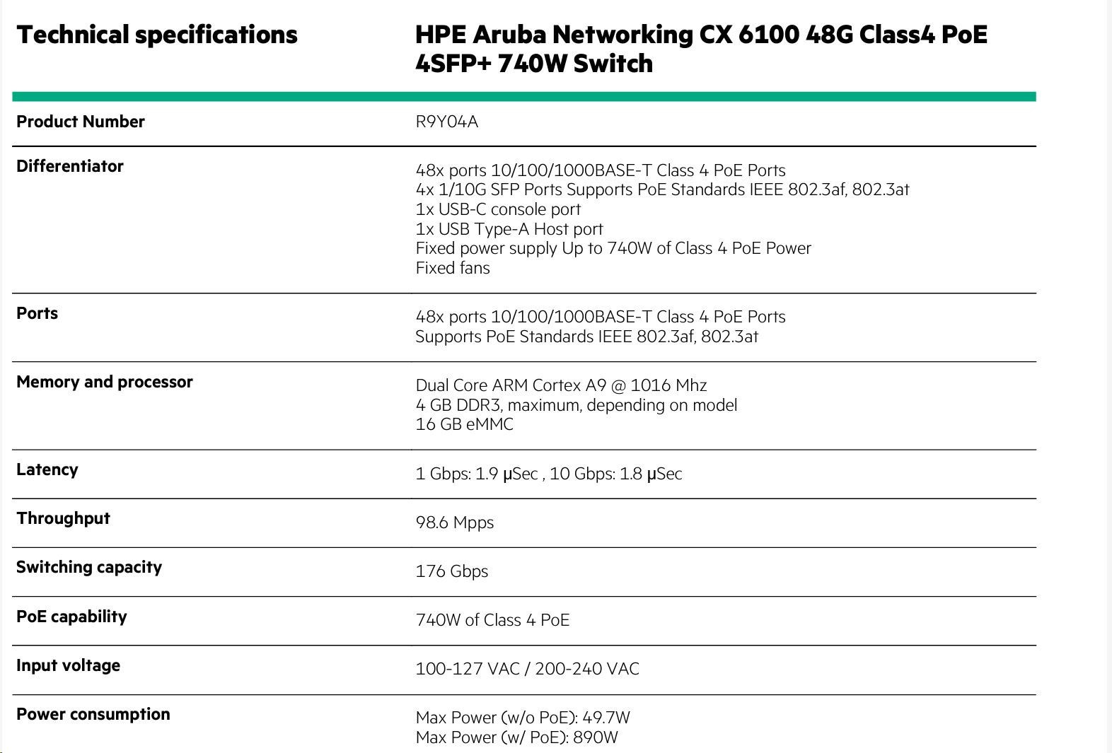 | Aruba 6100 48G CL4 4SFP+ 740W Sw (R9Y04A) | |