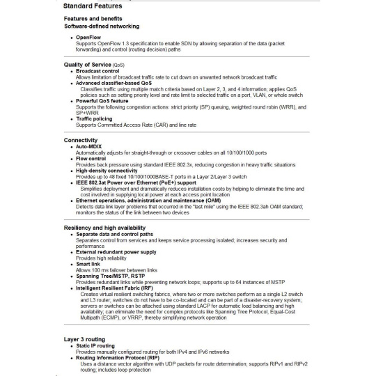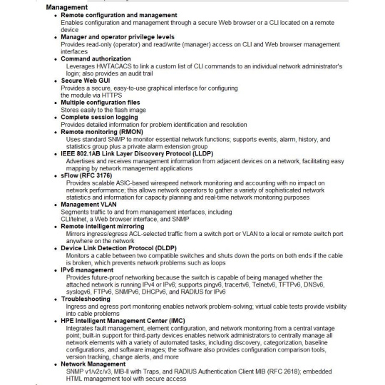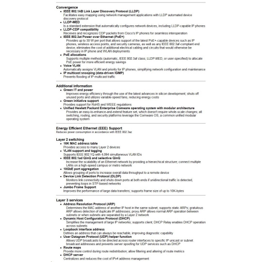 - Intelligent Resilient Fabric (IRF) Technology: Unifies multiple switches into one logical device, improving network resilience, performance, and availability while simplifying operations.