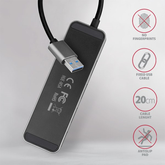 Kovový USB 3.2 Gen 1 (USB 3.0) Rozbočovač AXAGON HUE-MSA nielenže pripojí k notebooku alebo počítaču až štyri zariadenia USB súčasne, ale ponúka aj funkciu vypnutia portu USB a funkciu nabíjacieho rozbočovača. Kovové telo rozbočovača je vyrobené z hliníka a poskytuje dokonalú mechanickú ochranu pri častom prenášaní. Elegantný, jemne štruktúrovaný povrch zabraňuje nechceným odtlačkom prstov. Gumové nožičky zabraňujú kĺzaniu hubky po stole. 20 cm dlhý pevný kábel USB je ideálny pre používateľov mobilných zariadení.