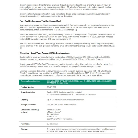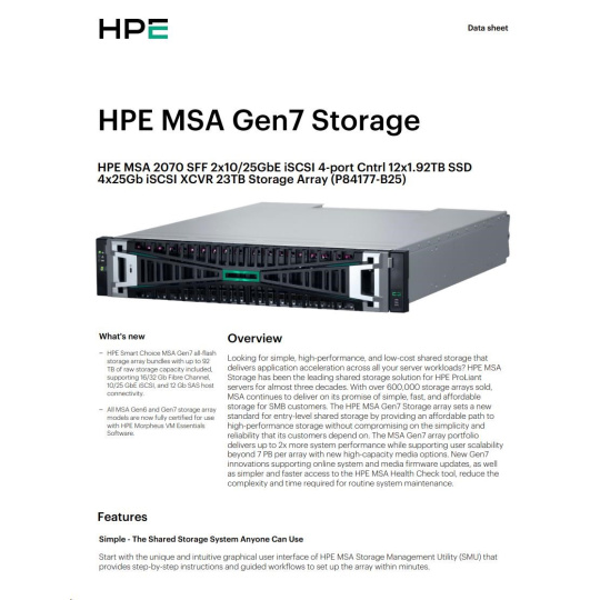 HPE MSA 2070 SFF 2x10/25GbE iSCSI 4-port Controller 12x1.92TB SSD 4x25Gb iSCSI XCVR 23TB Storage Array Smart Choice.