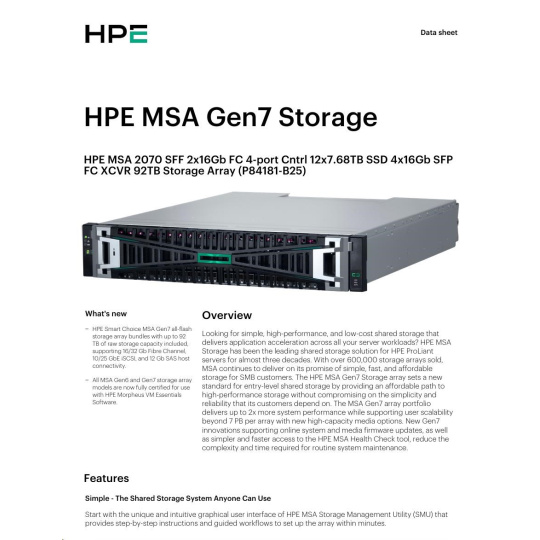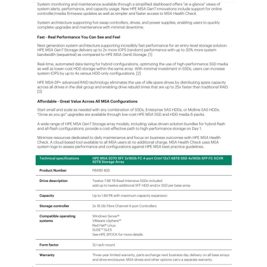 HPE MSA 2070 SFF 2x16Gb FC 4-port Controller 12x7.68TB SSD 4x16Gb SFP FC XCVR 92TB Storage Array Smart Choice.