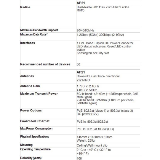 The HPE Networking Instant On Access Point AP21 features Orthogonal Frequency-Division Multiple Access (OFDMA) which allows them to handle multiple Wi-Fi 6 capable clients on each channel simultaneously; this improves efficiency by boosting overall capacity and reducing latency. Target Wake Time (TWT) – Ideal for IoT devices that communicate infrequently, TWT establishes a schedule for when clients need to communicate with an AP. This reduces power consumption and can extend the battery life of clients. Multiple Input, Multiple Output (MIMO) – Allows the access point to serve multiple clients (Wi-Fi 5 and Wi-Fi 6) simultaneously. - Safeguard Your Network With WPA-Enterprise Features