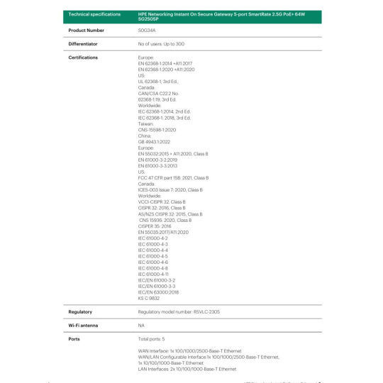 Pre väčšie prostredia ponúka HPE Networking Instant On Secure Gateway SG2505P päť portov, z ktorých dva poskytujú podporu pre multimediálne gigabity. Jeden multi-gig uplink (WAN), jeden multi-gig konfigurovateľný port (WAN/LAN), jeden gig konfigurovateľný port (WAN/LAN) a dva gig porty (LAN). SG2505P má podporu PoE s celkovým rozpočtom energie 64W na napájanie sieťových zariadení, ako sú Instant On prístupové body. S throughputom firewallu 2,3 Gbps je táto brána ideálna pre podniky, ktoré vyžadujú viac ako 1 gigabit celkovej priepustnosti od ISP. Či už ste malý obchod, ktorý chce udržať sieť jednoduchú, alebo start-up zameraný na AI s veľkými dátovými záťažami, SG2505P vám pomôže zostať pripojení a zabezpečení.