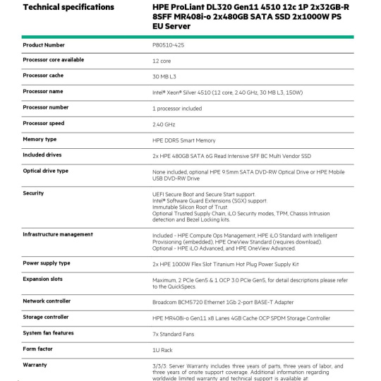 Model Name HPE PL DL320g11 4510 (2.4/12C) 2x32G 2x480G SATA SSD MR408i-o 8SFFBCU3 2x1000W 2x1Gb 1U EIR