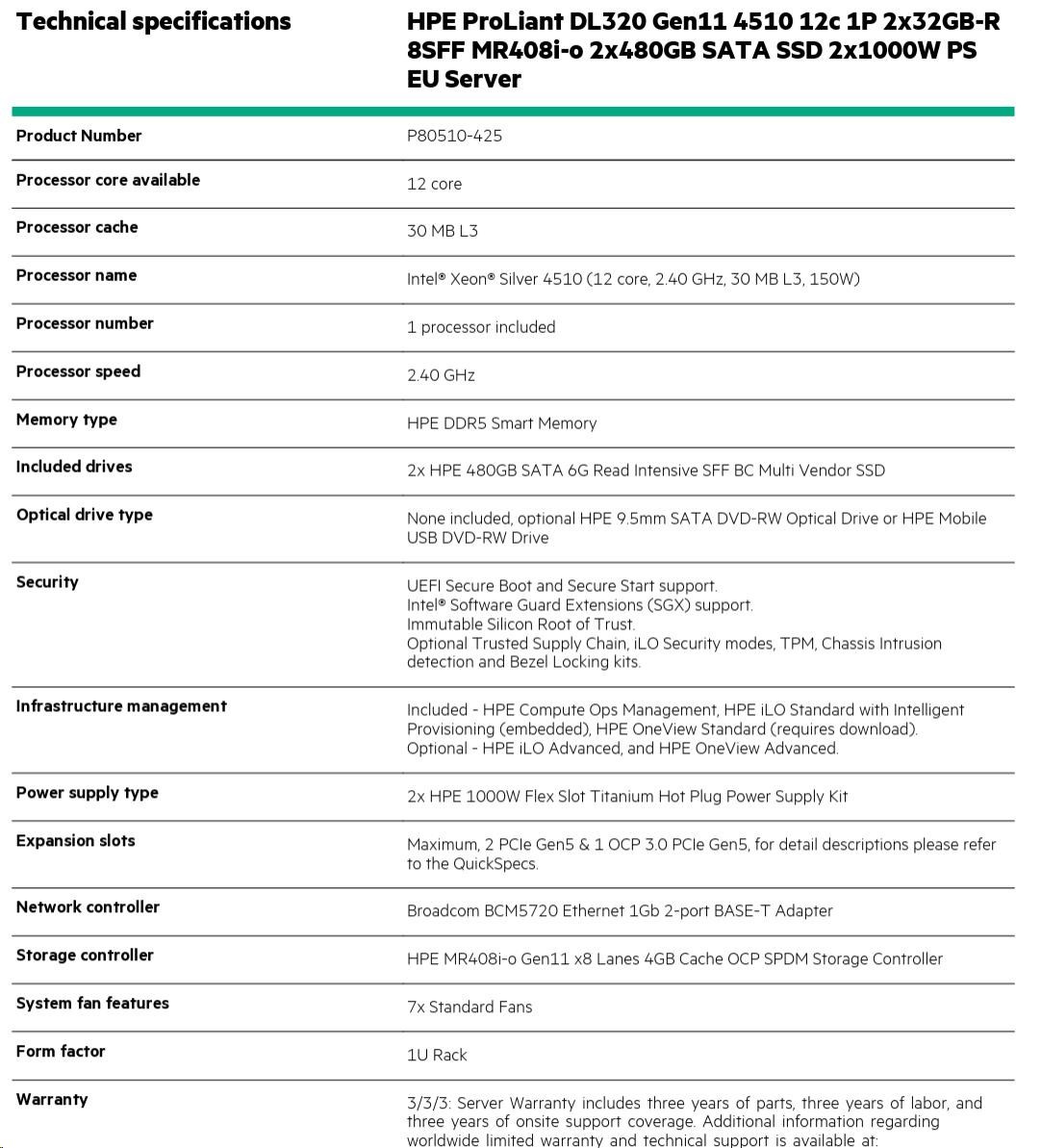 Model Name HPE PL DL320g11 4510 (2.4/12C) 2x32G 2x480G SATA SSD MR408i-o 8SFFBCU3 2x1000W 2x1Gb 1U EIR