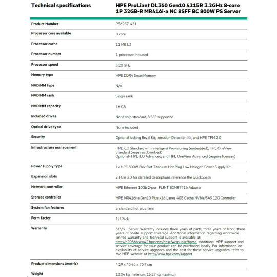 | Model Name | HPE ProLiant DL360 Gen10 4215R 3.20GHz 8-core 1P 32GB-R MR416i-a NC 8SFF BC 800W PS Server |