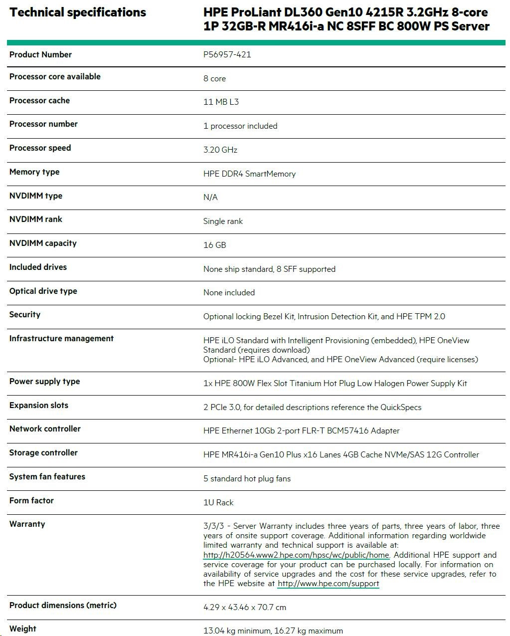 | Model Name | HPE ProLiant DL360 Gen10 4215R 3.20GHz 8-core 1P 32GB-R MR416i-a NC 8SFF BC 800W PS Server |