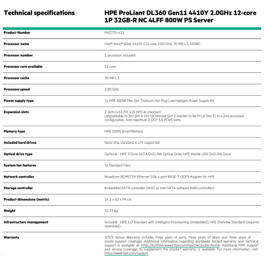 Model Name HPE ProLiant DL360 Gen11 4410Y 2.0GHz 12-core 1P 32GB-R NC 4LFF 800W PS Server
