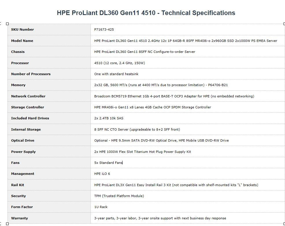 | Model Name | HPE ProLiant DL360 Gen11 4510 2.4GHz 12c 1P 64GB-R 8SFF MR408i-o 2x960GB SSD 2x1000W PS EMEA Server |