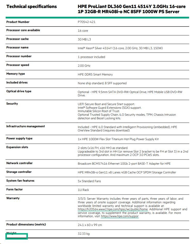 Model Name HPE PL DL360g11 4514Y (2.0/16C) 1x32G MR408i-o/4G 8-10SFF 1000W 2x10G-T NBD333 1U