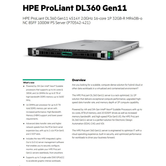 | Model Name | HPE ProLiant DL360 Gen11 4514Y 2.0GHz 16-core 1P 32GB-R MR408i-o NC 8SFF 1000W PS Server |
