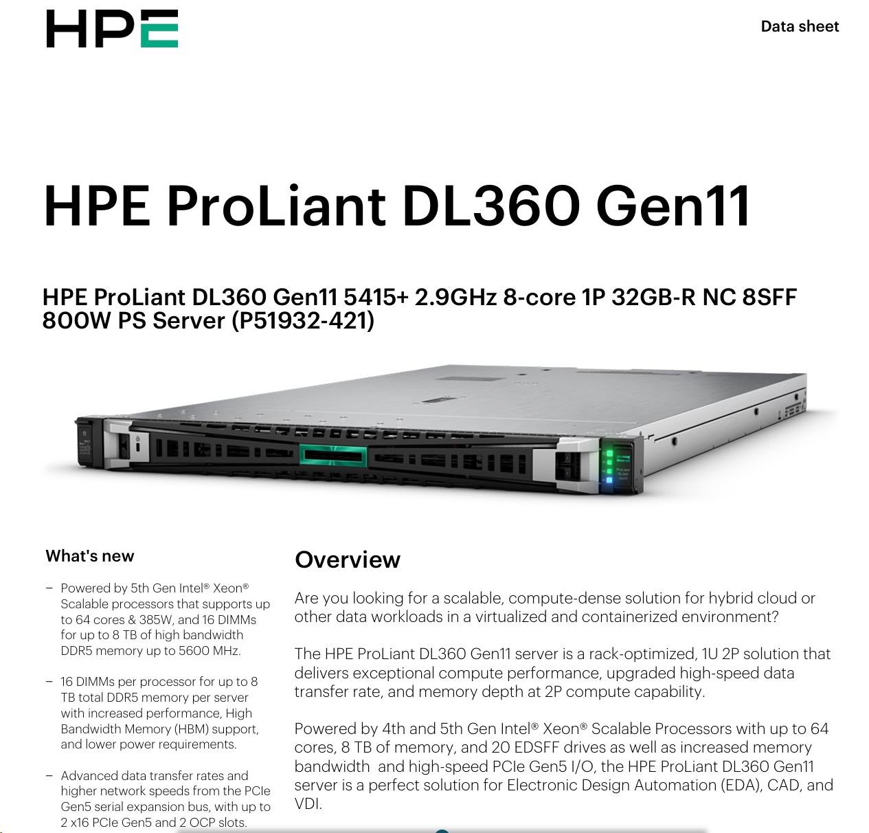 Model Name HPE ProLiant DL360 Gen11 5415+ 2.9GHz 8-core 1P 32GB-R NC 8SFF 800W PS Server