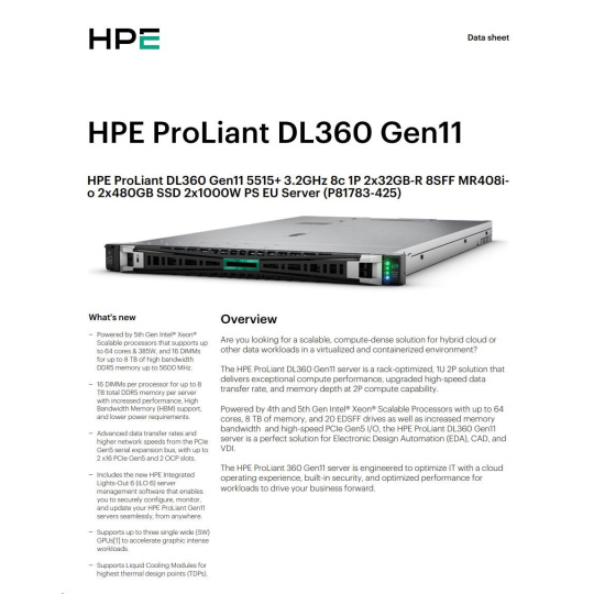 HPE PL DL360g11 5515+ (3.2G/8C) 2x32G (P64706) 8SFF MR408i-o/4G 2x480G 2x1000W 2x10G-T.