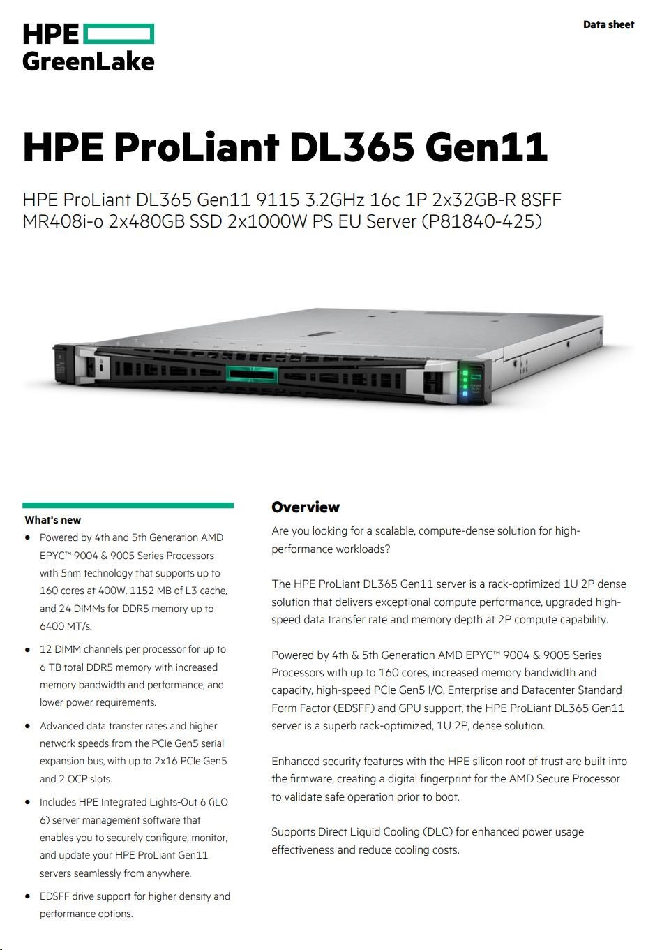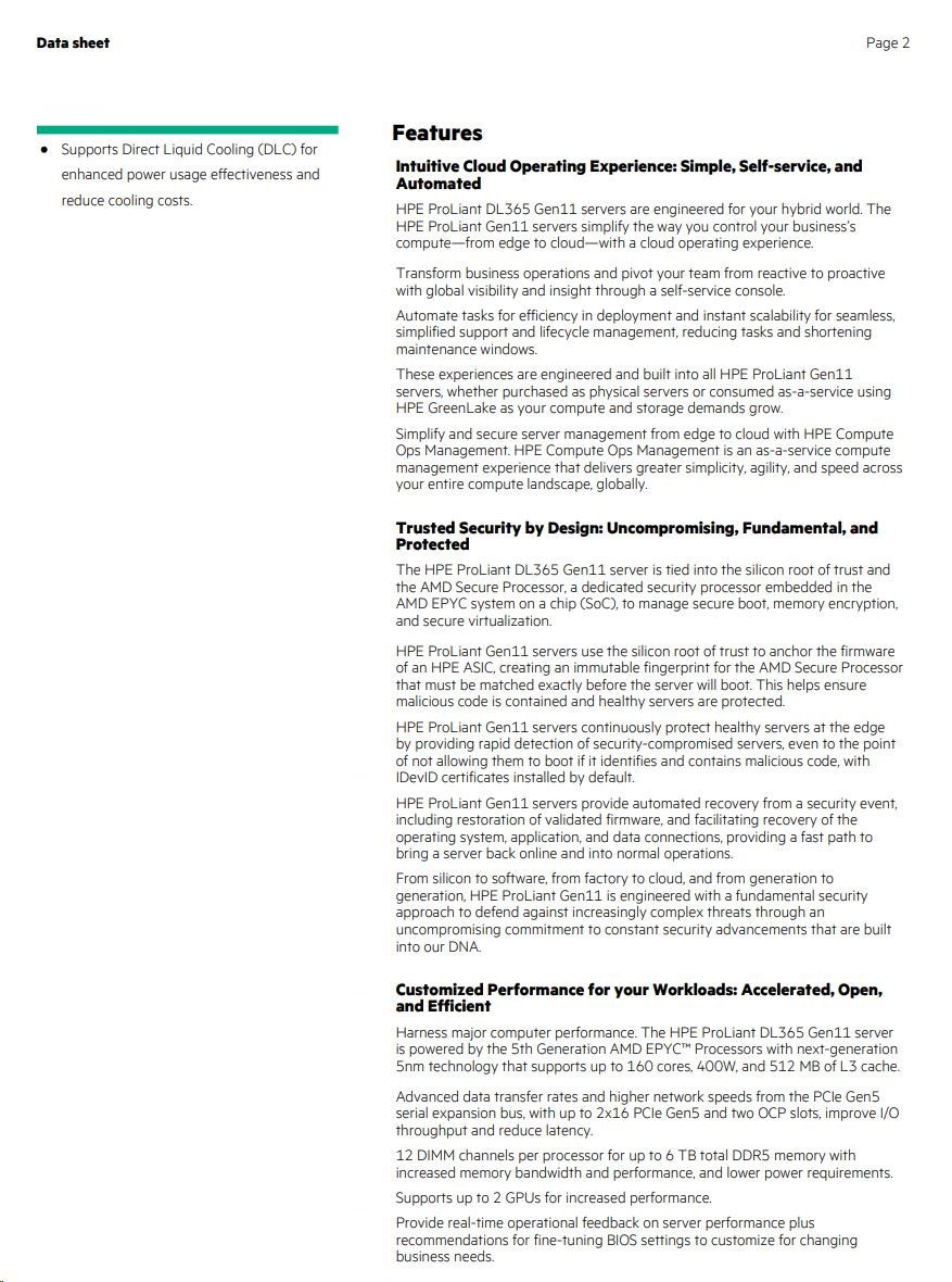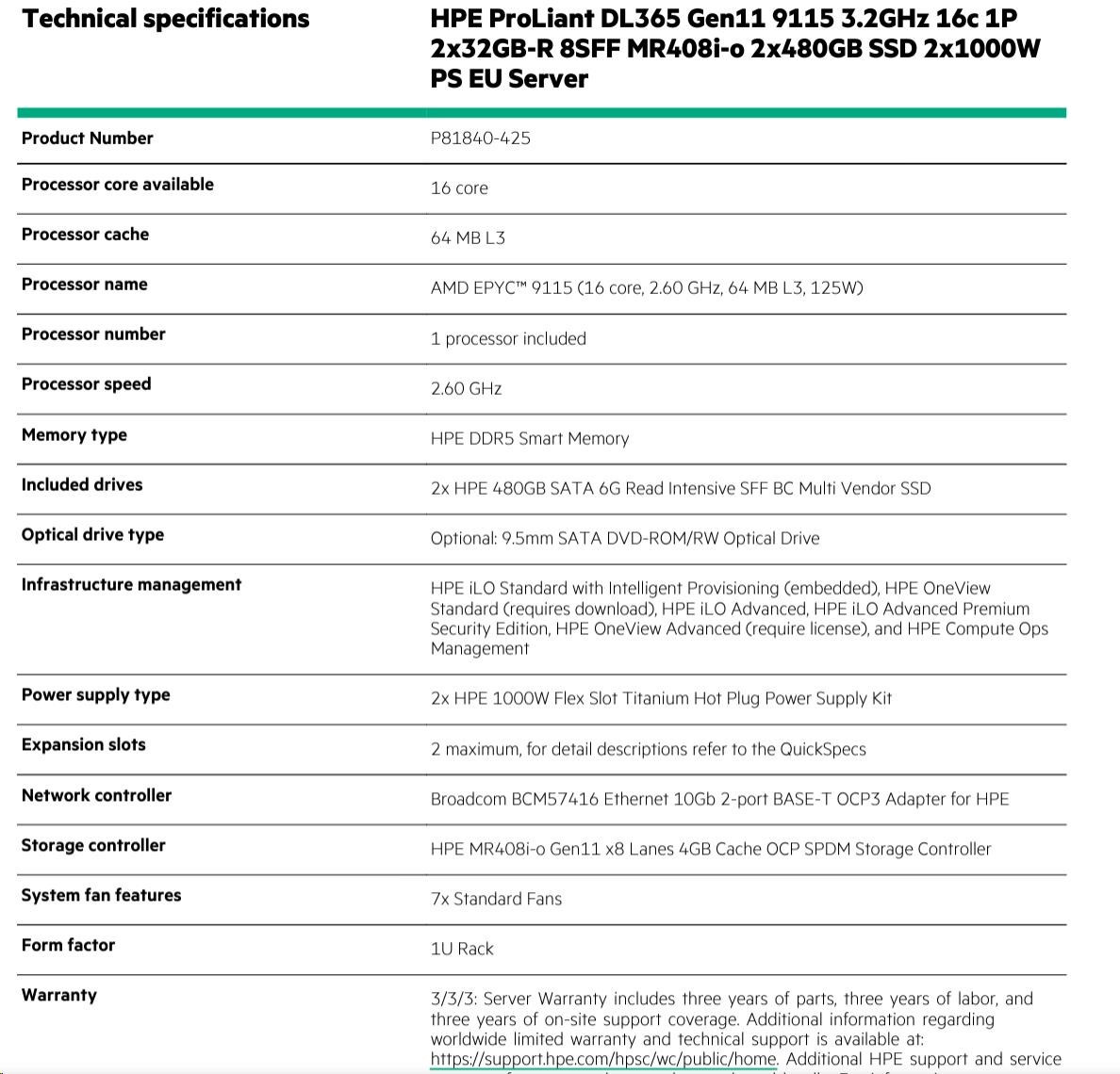 Processor core available 16 core Processor cache 64 MB L3 Processor name AMD EPYC™ 9115 (16 core, 2.60 GHz, 64 MB L3, 125W) Processor number 1 processor included Processor speed 2.60 GHz Memory type HPE DDR5 Smart Memory Included drives 2x HPE 480GB SATA 6G Read Intensive SFF BC Multi Vendor SSD Optical drive type Optional: 9.5mm SATA DVD-ROM/RW Optical Drive Infrastructure management HPE iLO Standard with Intelligent Provisioning (embedded), HPE OneView Standard (requires download), HPE iLO Advanced, HPE iLO Advanced Premium Security Edition, HPE OneView Advanced (require license), and HPE Compute Ops Management Power supply type 2x HPE 1000W Flex Slot Titanium Hot Plug Power Supply Kit Expansion slots 2 maximum, for detail descriptions refer to the QuickSpecs Network controller Broadcom BCM57416 Ethernet 10Gb 2-port BASE-T OCP3 Adapter for HPE Storage controller HPE MR408i-o Gen11 x8 Lanes 4GB Cache OCP SPDM Storage Controller System fan features 7x Standard Fans Form factor 1U Rack Warranty 3/3/3: Server Warranty includes three years of parts, three years of labor, and three years of on-site support coverage. Additional information regarding worldwide limited warranty and technical support is available at: https://support.hpe.com/hpsc/wc/public/home. Additional HPE support and service coverage for your product can be purchased locally. For information on availability of service upgrades and the cost for these service upgrades, refer to the HPE website at https://www.hpe.com/support. Product dimensions (metric) Weight 91.6 x 60 x 24.2 cm 29.36 kg