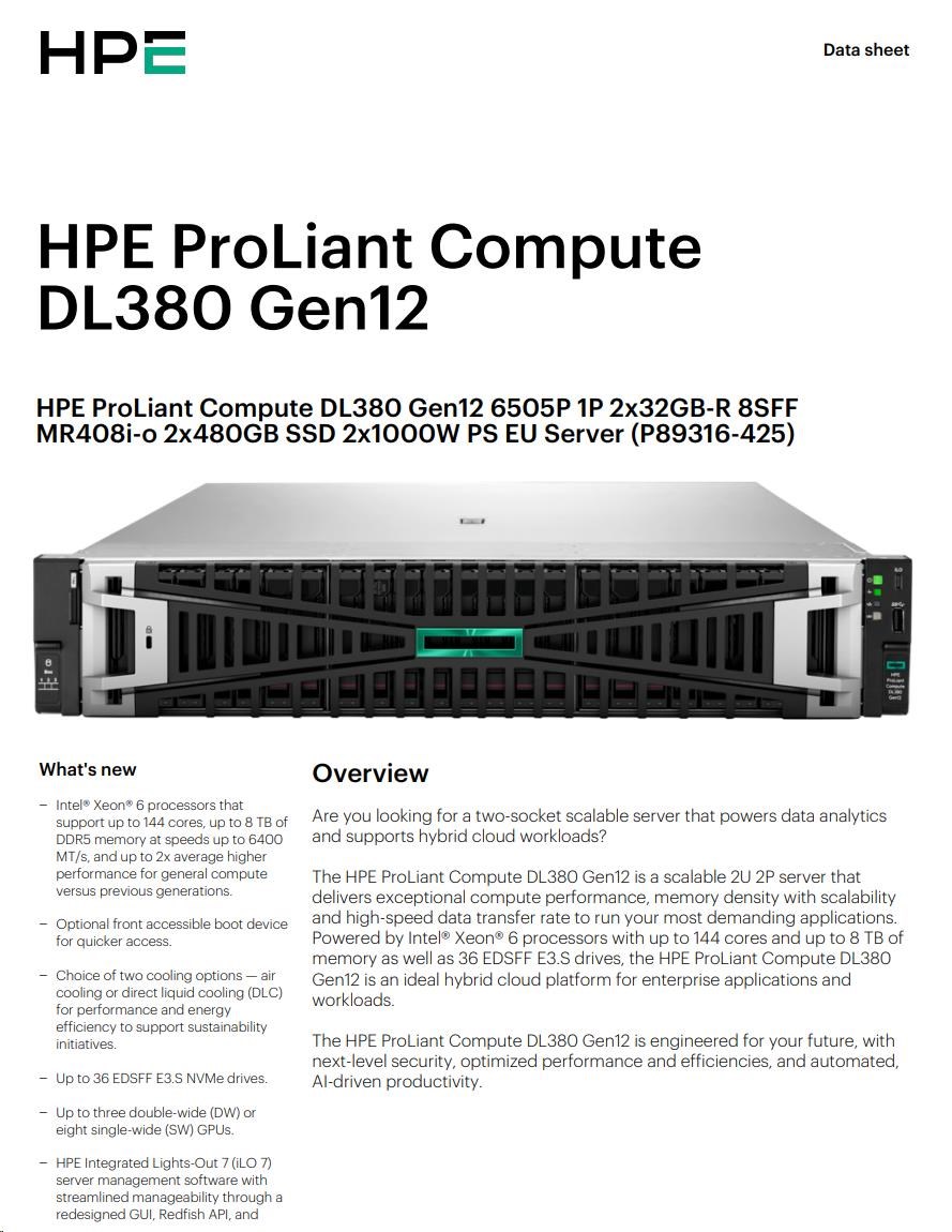 HPE PL DL380 Gen12 6505P (2.2/12C) 2x32G (P69727) 2x480G MR408i-o 8SFF 2x1000W 10GbE NBD333 Smart Choice.