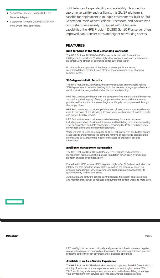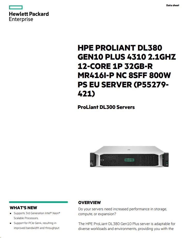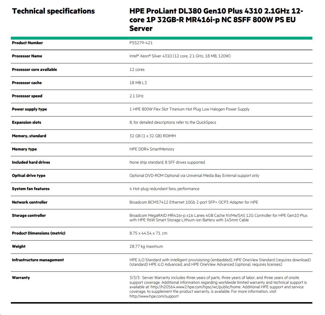 | Model Name | HPE ProLiant DL380 Gen10 Plus 4310 2.1GHz 12-core 1P 32GB-R MR416i-p NC 8SFF 800W PS EU Server |
