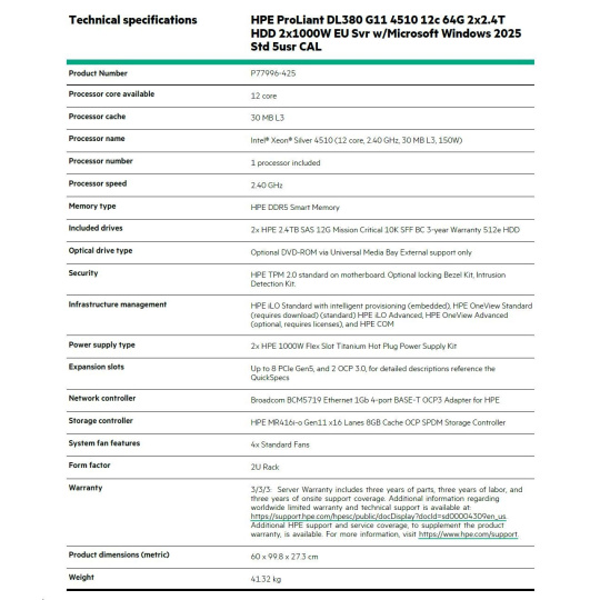 Model Name HPE PL DL380g11 4510 (2.4/12C) 2x32G (p64706) 2x2.4TB/10k MR416i-o/8G 2x1000W 8SFF 4x1G WS2025STD Smart Choice