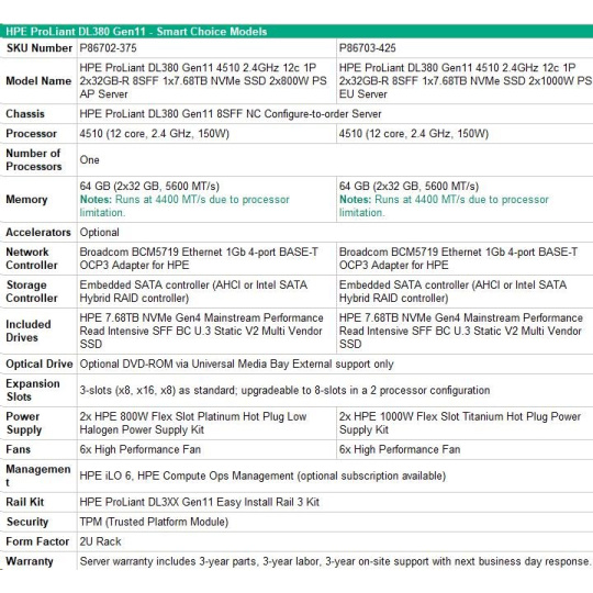 HPE PL DL380g11 4510 (2.4G/12C) 2x32G (p64706) 1x7.68TB NVMe 2x1000W 8SFF 4p1G Smart Choice.