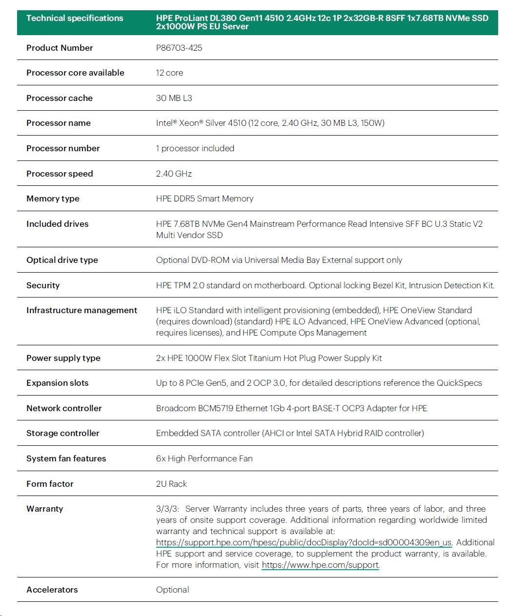 HPE PL DL380g11 4510 (2.4G/12C) 2x32G (p64706) 1x7.68TB (P64848) 2x1000W 8SFF VROC 8NVMe(P48825) 4p1G HPF Smart Choice
